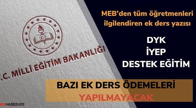MEB'den gelen son yazıyla 28 Mart 2020 tarihi itibariyle tüm ders dışı faaliyetlerin iptal edildiği, bu kapsamdaki ek ders ödemelerinin yapılmayacağı duyuruldu.