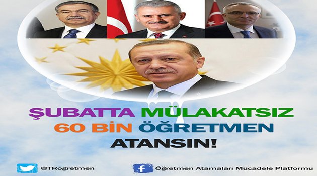 3 Ağustos 2016 tarihinde Resmi Gazete'de yayımlanan 29790 sayılı yönetmelikte yer alan "Sözleşmeli öğretmenlik pozisyonlarına şubat döneminde atama yapılır." ibaresine binaen; şubat ayında, sıkı güvenlik soruşturmasından geçerek liyakatin esas olduğu KPSS puanlarımızla MÜLAKATSIZ 60.000 ÖĞRETMEN ATANMASINI İSTİYORUZ.