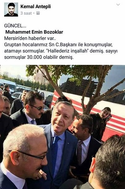 Konuşmasında gündem maddesi olarak değinilmese de kendisine özel olarak "Atama Yapılacak mı?"sorusunu yönelten öğretmen adaylarına "Hallederiz İnşaallah" şeklinde cevap veren CumhurbaşkanıErdoğan ne kadar atama yapılacağı hakkında sorulan soruya ise "30.000 olabilir" diye cevap verdi.