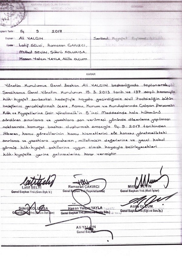 ''Eğitim-Bir-Sen Genel Yönetim Kurulu, 15 Mart 2013 tarihinde hayata geçirdiğimiz sivil itaatsizliğin bütün hedeflerini gerçekleştirmek üzere, Kamu Kurum ve Kuruluşlarında Çalışan Personelin Kılık ve Kıyafetlerine Dair Yönetmelik’in 5. maddesinde hâlâ hükmünü sürdüren sınırlama ve yasaklara son verilmesi yönünde düzenleme yapılmasını sağlamak için 14 Eylül 2017 tarihinden itibaren kamu görevlilerinin, kamu hizmetlerini söz konusu yönetmelikteki sınırlama ve yasaklara uymaksızın, toplumun değerlerine, genel kabul görmüş kılık-kıyafet şekillerine uygun olmak şartıyla belirleyecekleri kılık-kıyafetle yerine getirmelerine karar vermiştir.