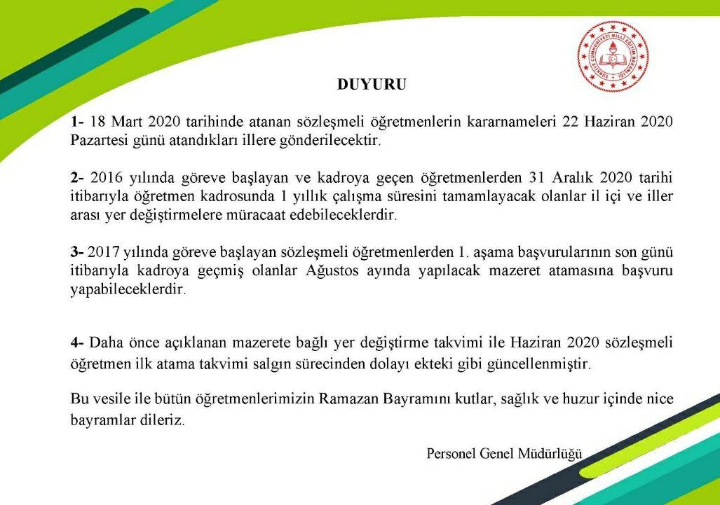 Duyuruya göre, göreve 2016'da başlayan ve kadroya geçen öğretmenlerden, 31 Aralık itibarıyla öğretmen kadrosunda 1 yıllık çalışma süresini tamamlayacak olanlar il içi ve iller arası yer değiştirmelere müracaat edebilecek.